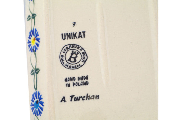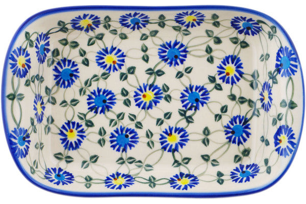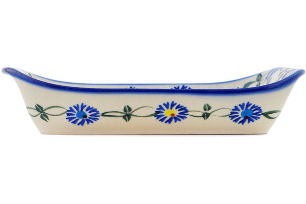 This Polish Pottery Platter with Handles is handmade and handpainted by the Ceramika Bona factory in Boleslawiec, Poland. Manufacturer item number H2220R. It is 1¾" high and measures 8¾" by 5¾". The weight of this Platter with Handles is 1.2 lbs. It is part of the Blue Thistle Beauty Collection.