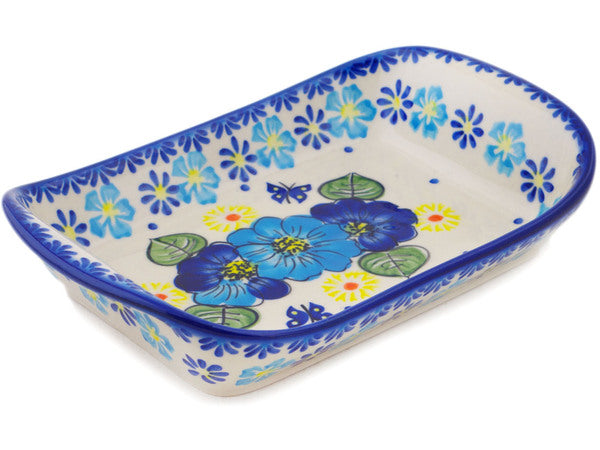 This Polish Pottery Platter with Handles is handmade and handpainted by the Ceramika Bona factory in Boleslawiec, Poland. Manufacturer item number H3167Q. It is 1¾" high and measures 8¾" by 5¾". The weight of this Platter with Handles is 1.2 lbs. It is part of the Endless Summer Collection.