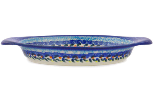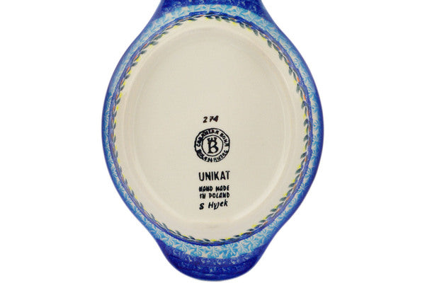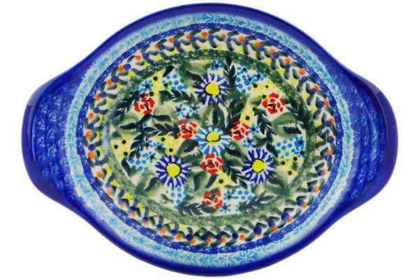 This Polish Pottery Platter with Handles is handmade and handpainted by the Ceramika Bona factory in Boleslawiec, Poland. Manufacturer item number H7692K. It is 1" high and measures 8¾" by 6¼". The capacity of this Platter with Handles is 7.78 oz (brimful) and it weighs 0.9 lbs. It is part of the Flor-De-Lis Collection.