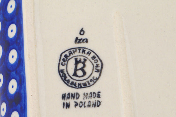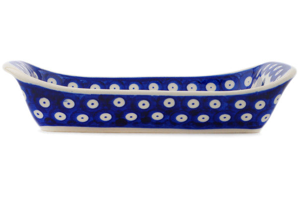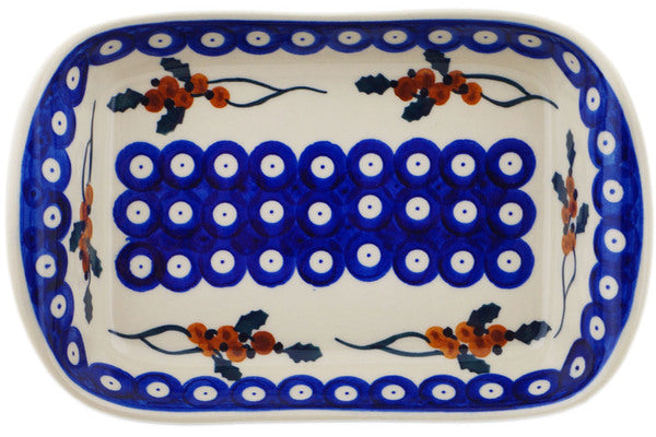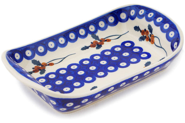 This Polish Pottery Platter with Handles is handmade and handpainted by the Ceramika Bona factory in Boleslawiec, Poland. Manufacturer item number H4121Q. It is 1¾" high and measures 8¾" by 5¾". The weight of this Platter with Handles is 1.2 lbs. It is part of the Yellow Holly Berries Collection.