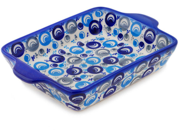 This Polish Pottery Rectangular Baker with Handles is handmade and handpainted by the Ceramika Bona factory in Boleslawiec, Poland. Manufacturer item number H3126Q. It is 1¾" high and measures 8¾" by 6". The capacity of this Rectangular Baker with Handles is 21.88 oz (brimful) and it weighs 1.3 lbs. It is part of the Blue Peacock Eye Collection.