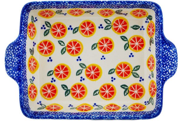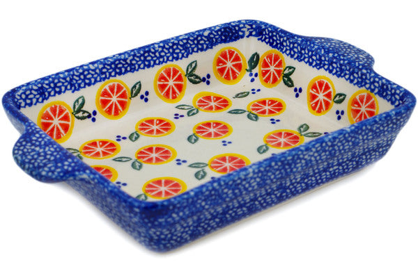 This Polish Pottery Rectangular Baker with Handles is handmade and handpainted by the Ceramika Bona factory in Boleslawiec, Poland. Manufacturer item number H1947P. It is 1¾" high and measures 8¾" by 6". The capacity of this Rectangular Baker with Handles is 21.88 oz (brimful) and it weighs 1.3 lbs. It is part of the Citrus Craze Collection.
