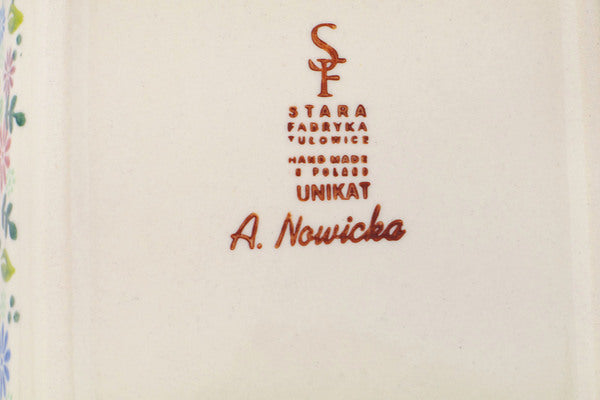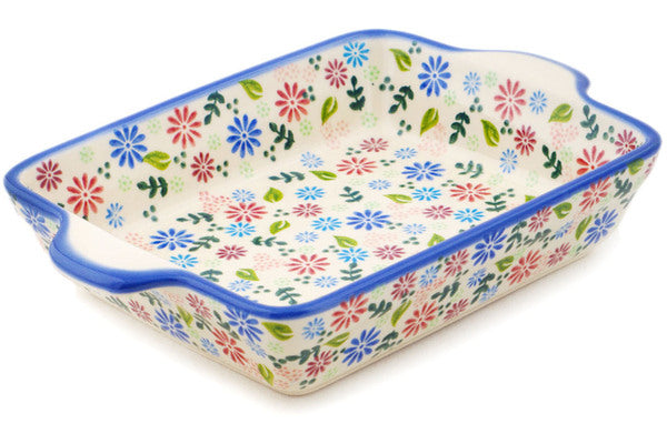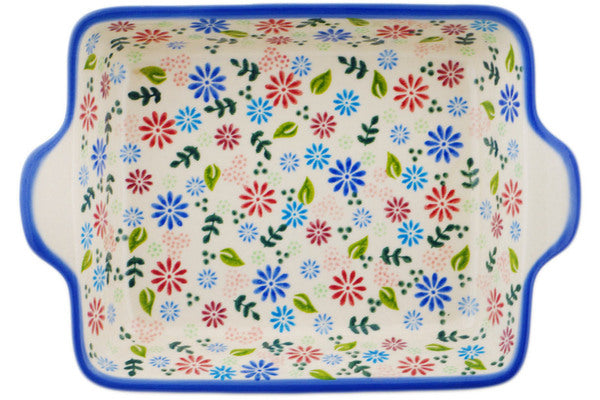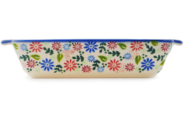 This Polish Pottery Rectangular Baker with Handles is handmade and handpainted by the Stara Fabryka factory in Boleslawiec, Poland. Manufacturer item number H6063R. It is 1¾" high and measures 8¾" by 6". The capacity of this Rectangular Baker with Handles is 19.54 oz (brimful) and it weighs 1.5 lbs. It is part of the Gerbera Garden Collection.