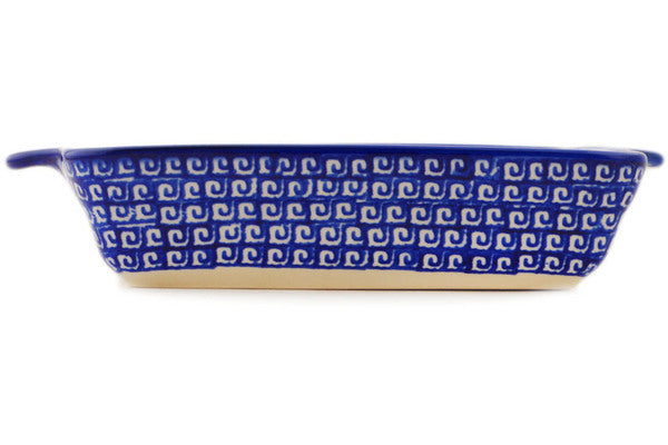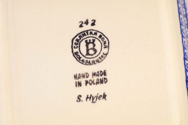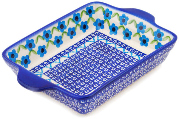 This Polish Pottery Rectangular Baker with Handles is handmade and handpainted by the Ceramika Bona factory in Boleslawiec, Poland. Manufacturer item number H5700P. It is 1¾" high and measures 8¾" by 6". The capacity of this Rectangular Baker with Handles is 21.88 oz (brimful) and it weighs 1.3 lbs. It is part of the Greek Daisies Collection.