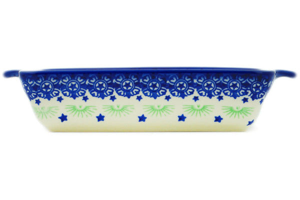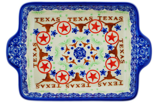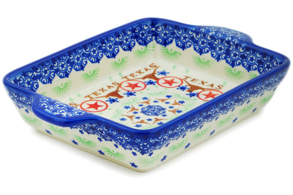 This Polish Pottery Rectangular Baker with Handles is handmade and handpainted by the Ceramika Bona factory in Boleslawiec, Poland. Manufacturer item number H0372N. It is 1¾" high and measures 8¾" by 6". The capacity of this Rectangular Baker with Handles is 21.88 oz (brimful) and it weighs 1.3 lbs. It is part of the Texas State Collection.