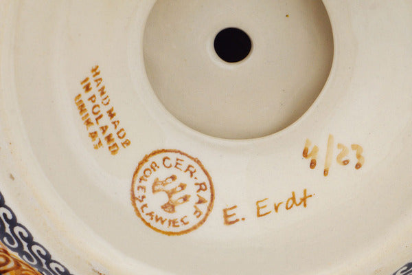 This is a Polish pottery Unikat (Signature) Roaster with Handles and Spout, which means that it has been hand painted with both sponges and brushes and it is signed by the artist who painted it. Unikat pieces are the most intricate works of art. Larger Unikat items take hours of very careful work to finish.
