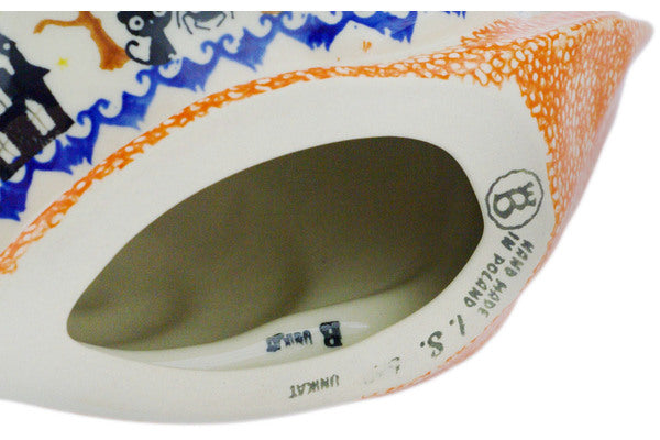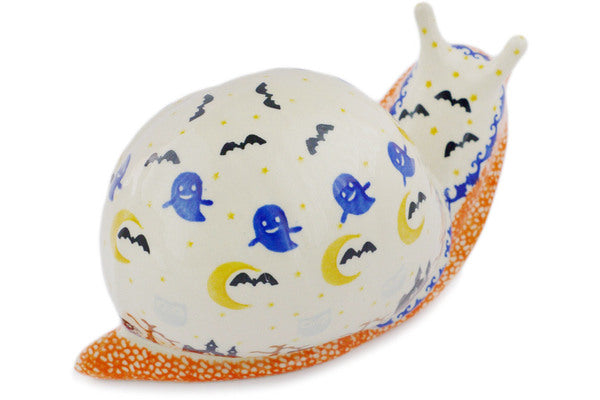 This Polish Pottery Snail Figurine is handmade and handpainted by the Ceramika Bona factory in Boleslawiec, Poland. Manufacturer item number H5869R. It is 5¼" high and measures 9¼" by 5". The weight of this Snail Figurine is 1.5 lbs. It is part of the Halloween Spooky Vibe Collection.