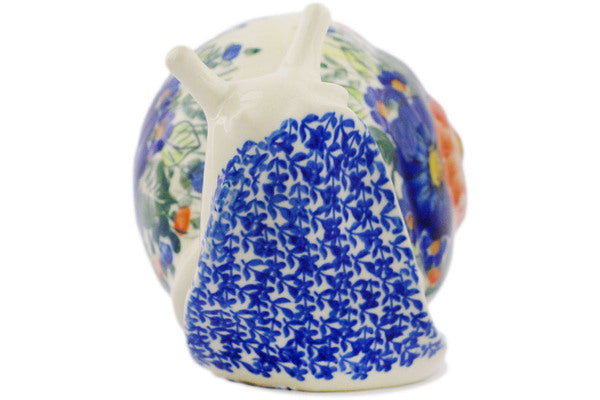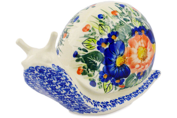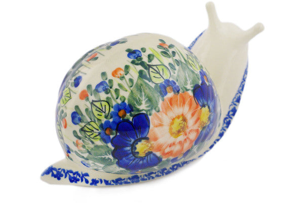 This Polish Pottery Snail Figurine is handmade and handpainted by the Ceramika Bona factory in Boleslawiec, Poland. Manufacturer item number H5465R. It is 5¼" high and measures 9¼" by 5". The weight of this Snail Figurine is 1.5 lbs. It is part of the Poppy Trio Collection.