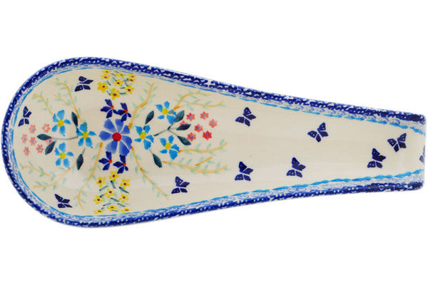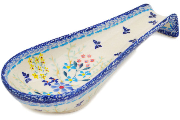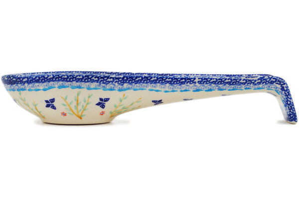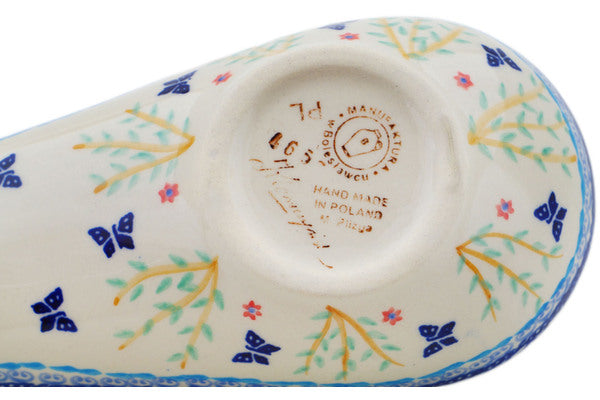 This Polish Pottery Spoon Rest is handmade and handpainted by the Manufaktura factory in Boleslawiec, Poland. Manufacturer item number H2426P. It is 1½" high and measures 9½" by 3½". The capacity of this Spoon Rest is 5.27 oz (brimful) and it weighs 0.8 lbs. It is part of the Breathtaking Butterflies Collection.