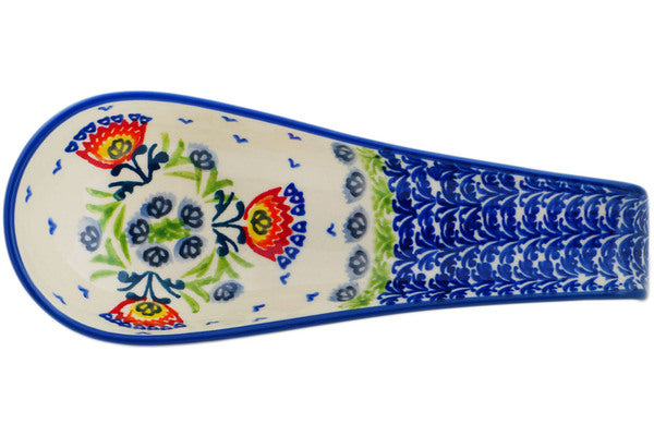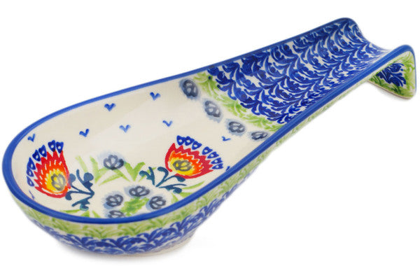 This Polish Pottery Spoon Rest is handmade and handpainted by the Manufaktura factory in Boleslawiec, Poland. Manufacturer item number H0404O. It is 1½" high and measures 9½" by 3½". The capacity of this Spoon Rest is 5.27 oz (brimful) and it weighs 0.8 lbs. It is part of the Flower Flames Collection.
