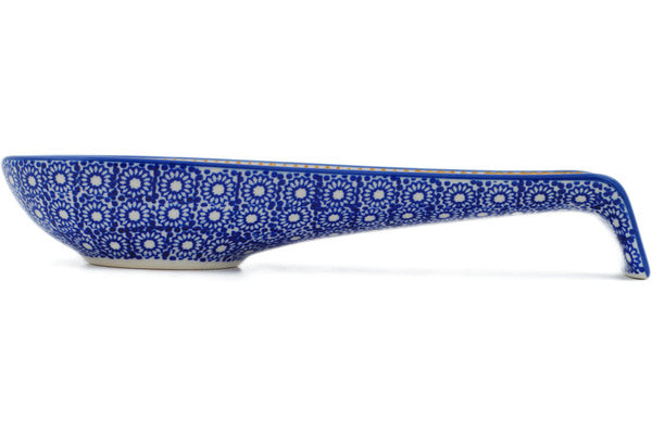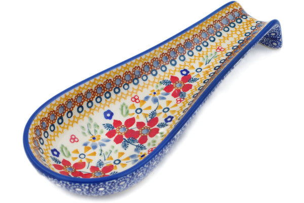 This Polish Pottery Spoon Rest is handmade and handpainted by the Manufaktura factory in Boleslawiec, Poland. Manufacturer item number H0361O. It is 1½" high and measures 9½" by 3½". The capacity of this Spoon Rest is 5.27 oz (brimful) and it weighs 0.8 lbs. It is part of the Summer Bouquet Collection.