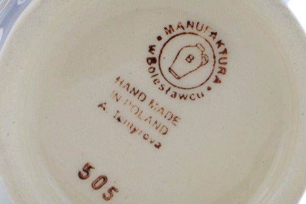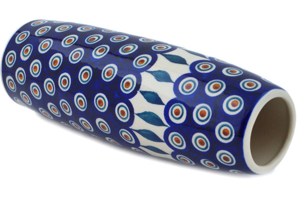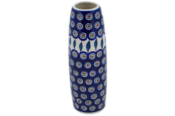 This Polish Pottery Vase is handmade and handpainted by the Manufaktura factory in Boleslawiec, Poland. Manufacturer item number H1022O. It is 9¼" high and measures 3¼" by 3¼". The capacity of this Vase is 24.89 oz (brimful) and it weighs 1.5 lbs. It is part of the Peacock Leaves Collection.