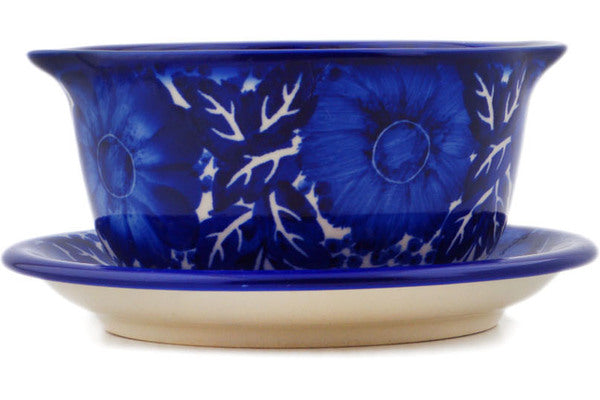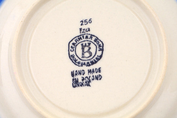 This Polish Pottery Bouillon Cup with Saucer is handmade and handpainted by the Ceramika Bona factory in Boleslawiec, Poland. Manufacturer item number H3042Q. It is 2½" high and measures 6½" by 6½". The capacity of this Bouillon Cup with Saucer is 15.49 oz (brimful) and it weighs 1.4 lbs. It is part of the Cobalt Fantasy Collection.