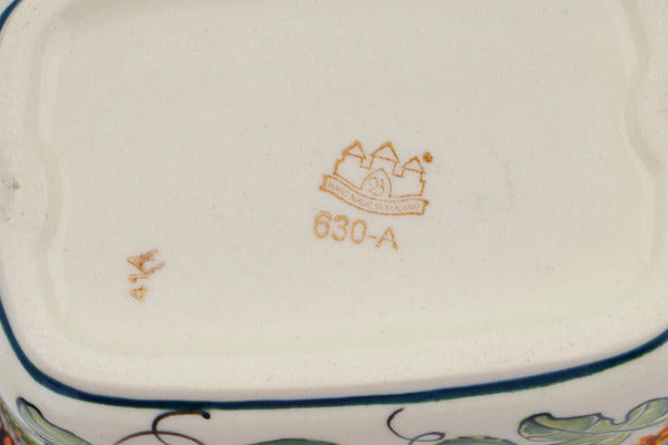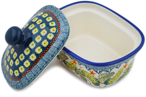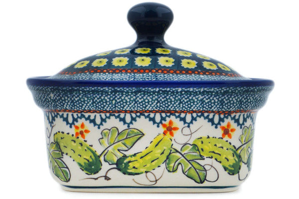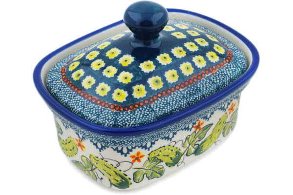 This Polish Pottery Butter Dish is handmade and handpainted by the Zaklady Ceramiczne factory in Boleslawiec, Poland. Manufacturer item number H1447N. It is 4½" high and measures 6¼" by 4¾". The weight of this Butter Dish is 1.7 lbs. It is part of the Cucumber Patch Collection.