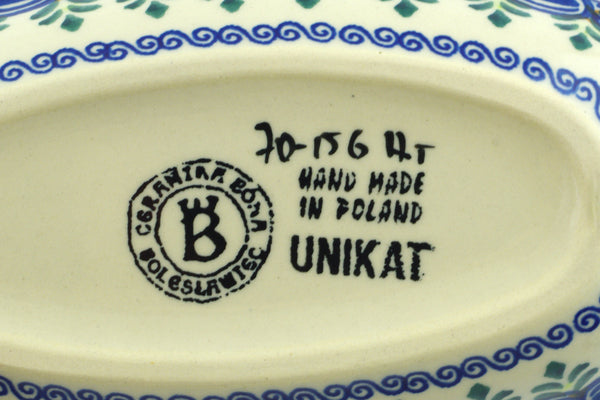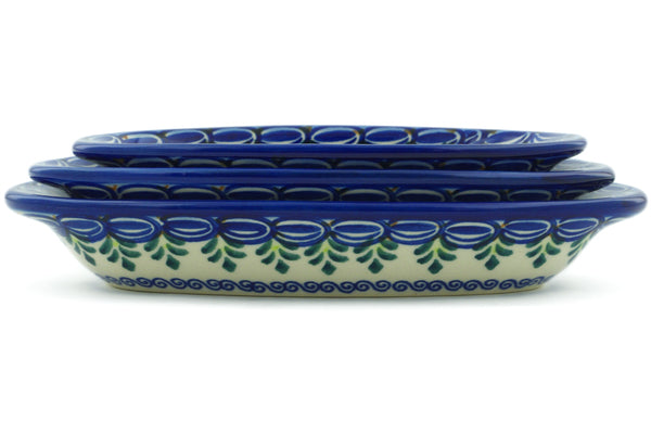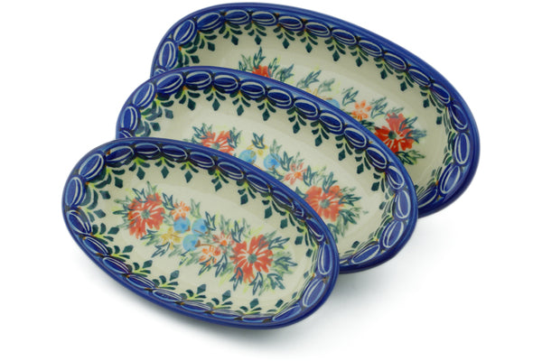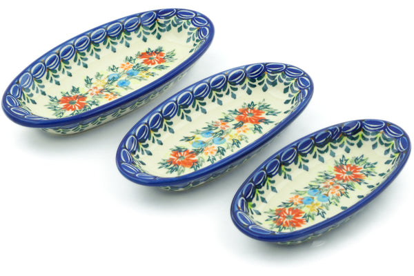 This Polish Pottery Set of 3 Nesting Condiment Dishes is handmade and handpainted by the Ceramika Bona factory in Boleslawiec, Poland. Manufacturer item number H5395J. It is 1¾" high and measures 7¼" by 3½". The weight of this Set of 3 Nesting Condiment Dishes is 1.0 lbs. It is part of the Ring Of Flowers Collection.