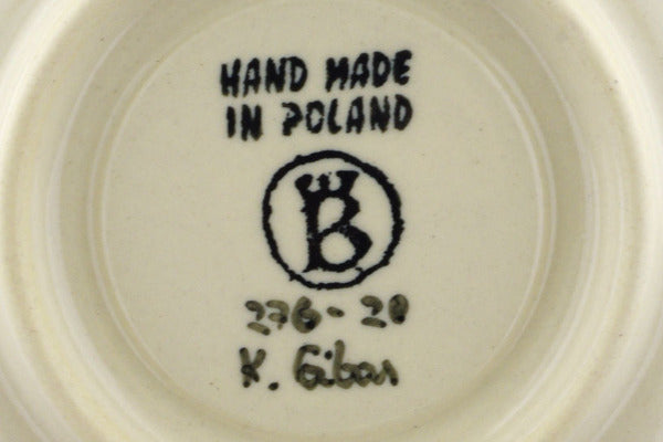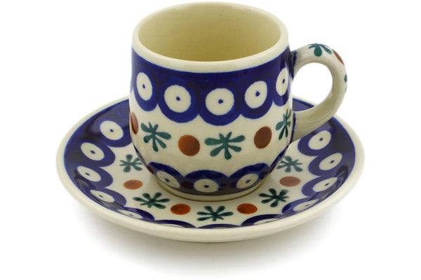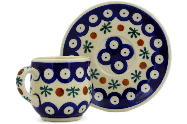 This Polish Pottery Espresso Cup with Saucer is handmade and handpainted by the Ceramika Bona factory in Boleslawiec, Poland. Manufacturer item number H5033J. It is 2½" high and measures 4¾" by 4¾". The capacity of this Espresso Cup with Saucer is 3.92 oz (brimful) and it weighs 0.6 lbs. It is part of the Mosquito Collection.