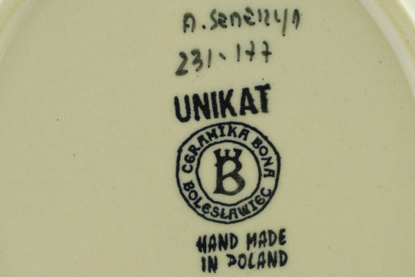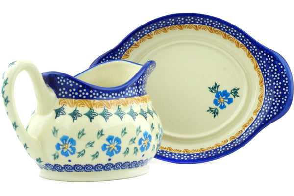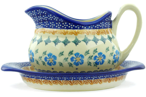 This Polish Pottery Gravy Boat with Saucer is handmade and handpainted by the Ceramika Bona factory in Boleslawiec, Poland. Manufacturer item number H5043J. It is 4¼" high and measures 8¾" by 6¼". The capacity of this Gravy Boat with Saucer is 18.60 oz (brimful) and it weighs 2.3 lbs. It is part of the Blue Cornflower Collection.