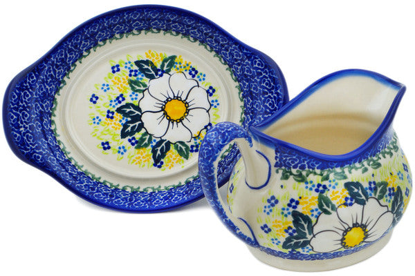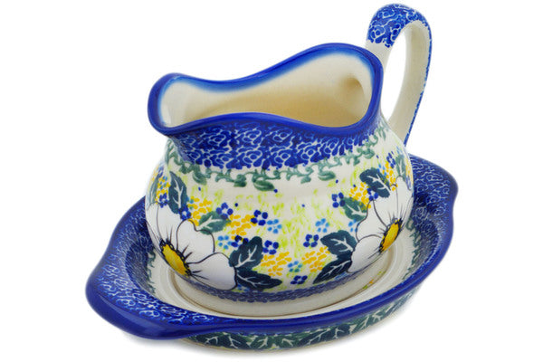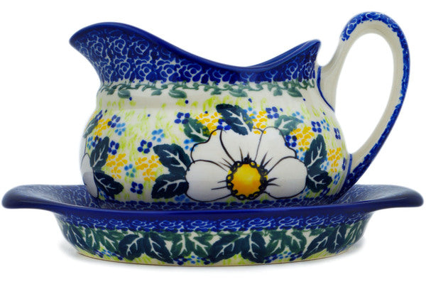 This Polish Pottery Gravy Boat with Saucer is handmade and handpainted by the Ceramika Nina factory in Boleslawiec, Poland. Manufacturer item number H5766O. It is 4¼" high and measures 8¾" by 6¼". The capacity of this Gravy Boat with Saucer is 18.60 oz (brimful) and it weighs 2.3 lbs. It is part of the Floral Fantasy Collection.