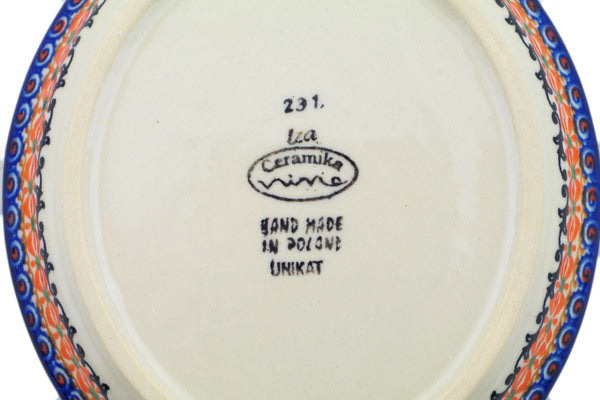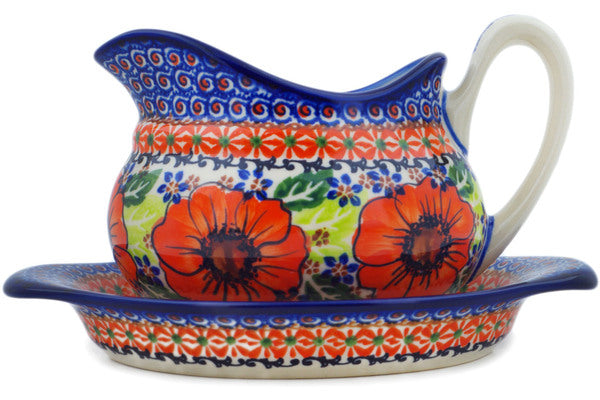This Polish Pottery Gravy Boat with Saucer is handmade and handpainted by the Ceramika Nina factory in Boleslawiec, Poland. Manufacturer item number H9639O. It is 4¼" high and measures 8¾" by 6¼". The capacity of this Gravy Boat with Saucer is 18.60 oz (brimful) and it weighs 2.3 lbs. It is part of the Orange Zinnia Collection.