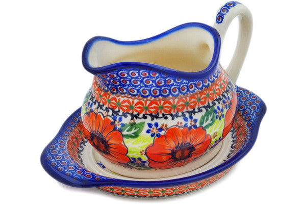 This is a Polish pottery Unikat (Signature) Gravy Boat with Saucer, which means that it has been hand painted with both sponges and brushes and it is signed by the artist who painted it. Unikat pieces are the most intricate works of art. Larger Unikat items take hours of very careful work to finish.