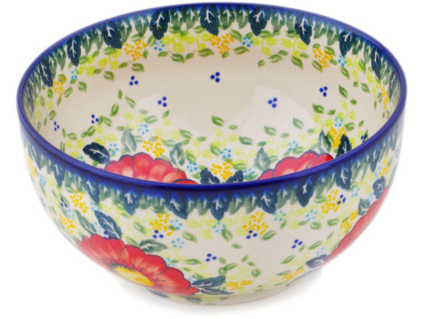 This Polish Pottery Bowl is handmade and handpainted by the Ceramika Nina factory in Boleslawiec, Poland. Manufacturer item number H0458P. It is 4½" high and measures 9" by 9". The capacity of this Bowl is 101.51 oz (brimful) and it weighs 2.8 lbs. It is part of the Bloom Tales Collection.