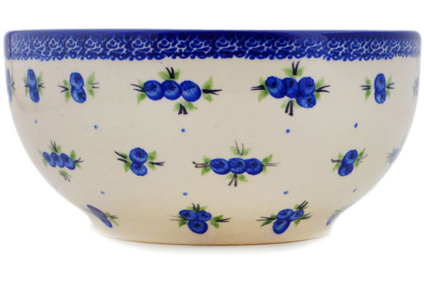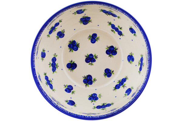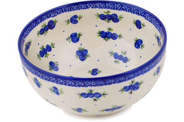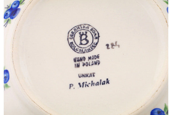 This Polish Pottery Bowl is handmade and handpainted by the Ceramika Bona factory in Boleslawiec, Poland. Manufacturer item number H0857P. It is 4½" high and measures 9" by 9". The capacity of this Bowl is 101.51 oz (brimful) and it weighs 2.8 lbs. It is part of the Blueberry Dreams Collection.