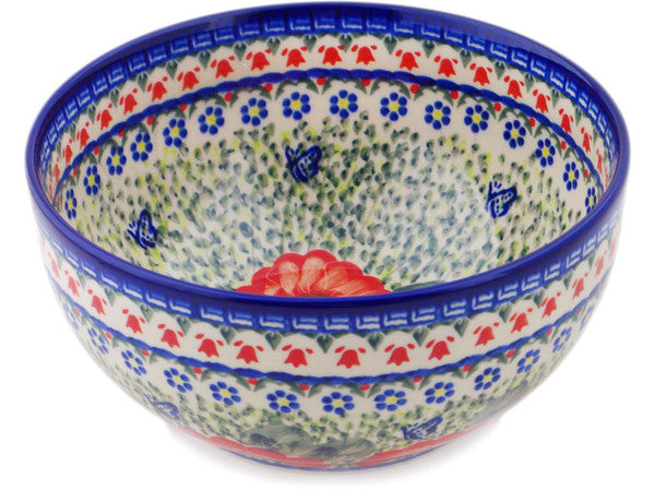 This Polish Pottery Bowl is handmade and handpainted by the Ceramika Bona factory in Boleslawiec, Poland. Manufacturer item number H3112Q. It is 4½" high and measures 9" by 9". The capacity of this Bowl is 101.51 oz (brimful) and it weighs 2.8 lbs. It is part of the Happiness Collection.