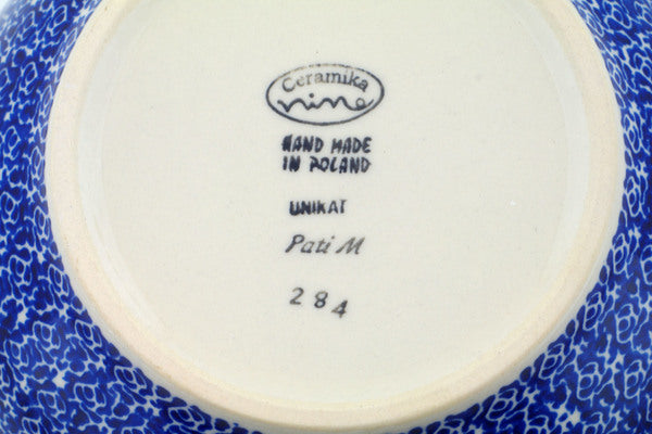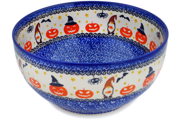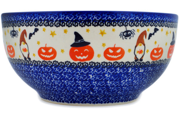 This Polish Pottery Bowl is handmade and handpainted by the Ceramika Nina factory in Boleslawiec, Poland. Manufacturer item number H1505P. It is 4½" high and measures 9" by 9". The capacity of this Bowl is 101.51 oz (brimful) and it weighs 2.8 lbs. It is part of the Harvest Haunt Collection.