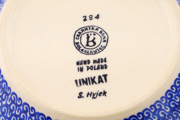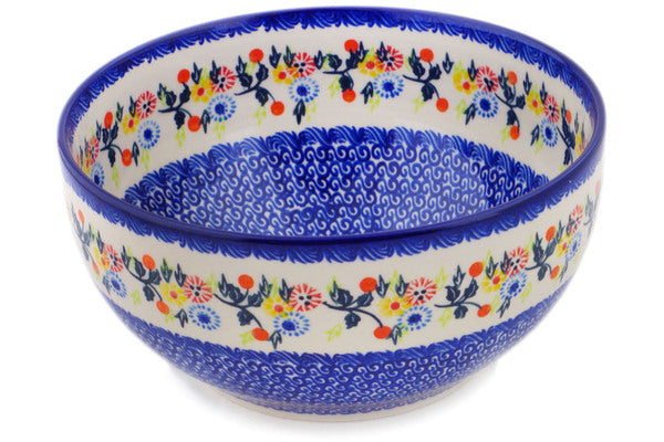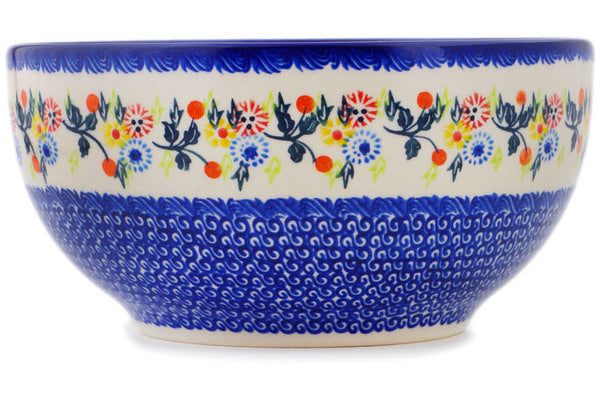 This Polish Pottery Bowl is handmade and handpainted by the Ceramika Bona factory in Boleslawiec, Poland. Manufacturer item number H1951R. It is 4½" high and measures 9" by 9". The capacity of this Bowl is 101.51 oz (brimful) and it weighs 2.8 lbs. It is part of the Pastel Spring Wreath Collection.