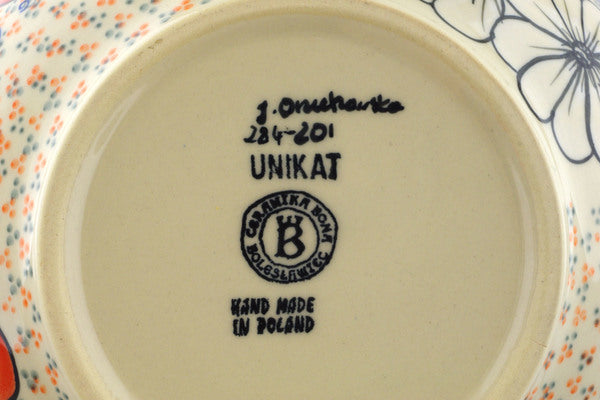 This is a Polish pottery Unikat (Signature) Bowl, which means that it has been hand painted with both sponges and brushes and it is signed by the artist who painted it. Unikat pieces are the most intricate works of art. Larger Unikat items take hours of very careful work to finish.