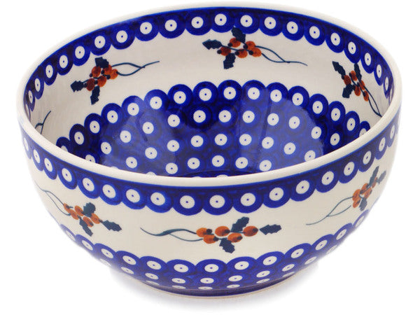 This Polish Pottery Bowl is handmade and handpainted by the Ceramika Bona factory in Boleslawiec, Poland. Manufacturer item number H4025Q. It is 4½" high and measures 9" by 9". The capacity of this Bowl is 101.51 oz (brimful) and it weighs 2.8 lbs. It is part of the Yellow Holly Berries Collection.
