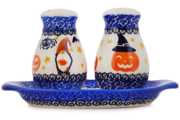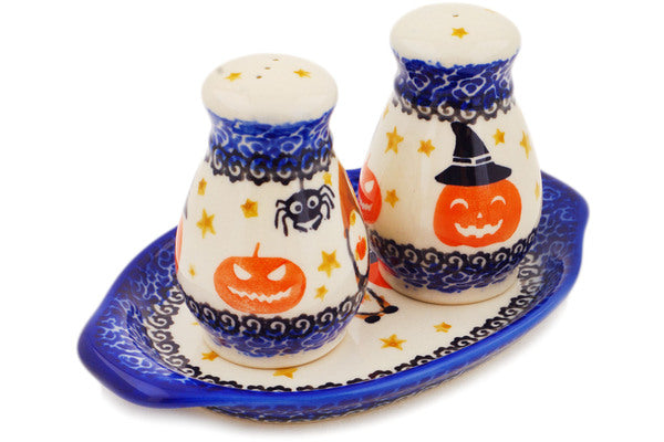 This Polish Pottery Salt and Pepper Set is handmade and handpainted by the Ceramika Nina factory in Boleslawiec, Poland. Manufacturer item number H5842O. It is 3¼" high and measures 6½" by 4¼". The capacity of this Salt and Pepper Set is 2.30 oz (brimful) and it weighs 1.0 lbs. It is part of the Harvest Haunt Collection.