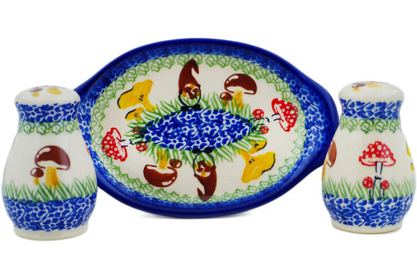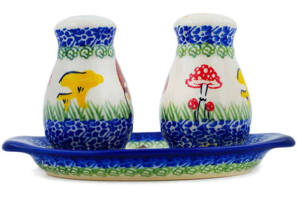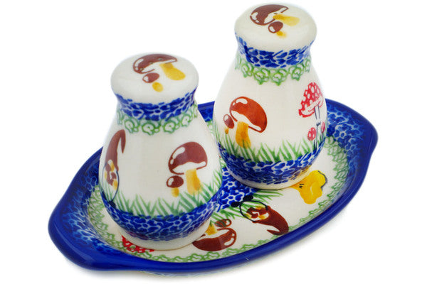 This Polish Pottery Salt and Pepper Set is handmade and handpainted by the Ceramika Nina factory in Boleslawiec, Poland. Manufacturer item number H5840O. It is 3¼" high and measures 6½" by 4¼". The capacity of this Salt and Pepper Set is 2.30 oz (brimful) and it weighs 1.0 lbs. It is part of the Mushroom Garden Collection.