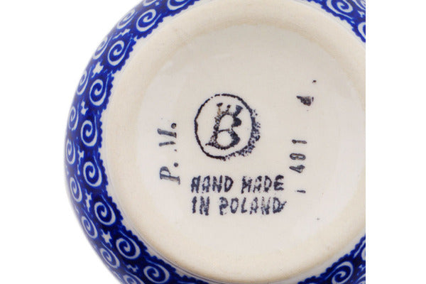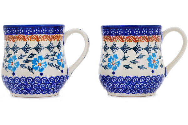 This Polish Pottery Set of 2 Mugs is handmade and handpainted by the Ceramika Bona factory in Boleslawiec, Poland. Manufacturer item number H2850Q. It is 3¾" high and measures 4½" by 3¼". The capacity of this Set of 2 Mugs is 13.53 oz (brimful) and it weighs 0.7 lbs. It is part of the Blue Cornflower Collection.