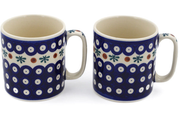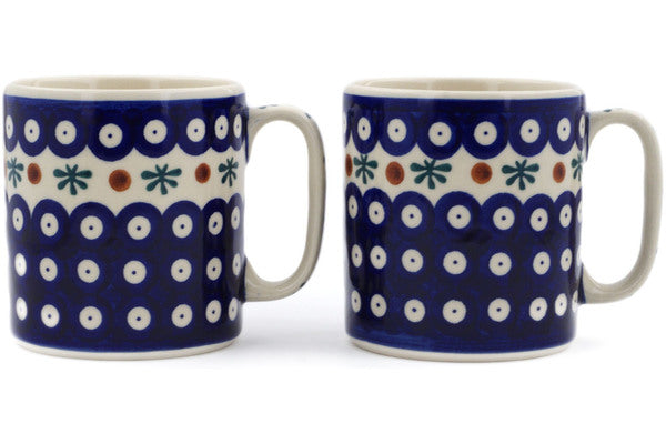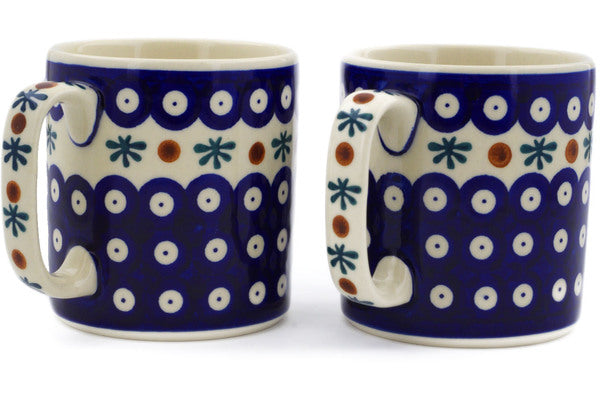 This Polish Pottery Set of 2 Mugs is handmade and handpainted by the Ceramika Bona factory in Boleslawiec, Poland. Manufacturer item number H0068K. It is 6¼" high and measures 10" by 6¼". The capacity of this Set of 2 Mugs is 24.00 oz (brimful) and it weighs 2.8 lbs. It is part of the Mosquito Collection.