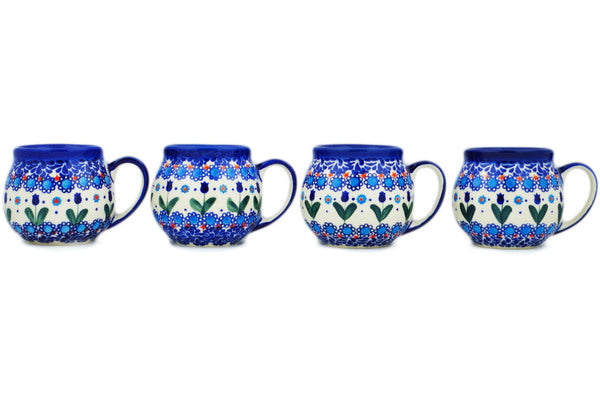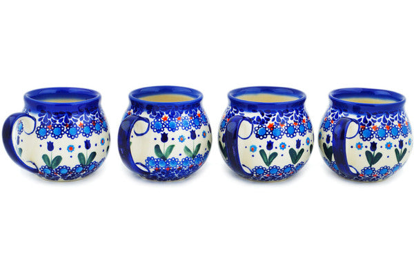 This Polish Pottery Set of 4 Mugs is handmade and handpainted by the Two People factory in Boleslawiec, Poland. Manufacturer item number H9756M. It is 3½" high and measures 5" by 3¾". The capacity of this Set of 4 Mugs is 12.21 oz (brimful) and it weighs 0.7 lbs. It is part of the Blue Tulip Garden Collection.