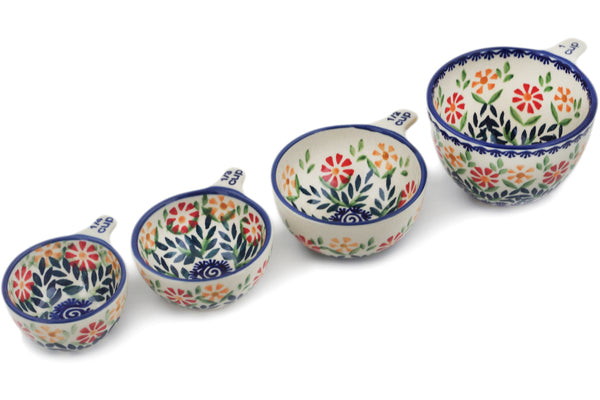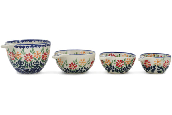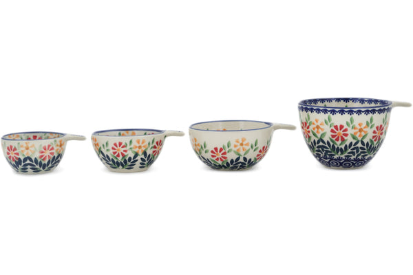 This Polish Pottery Set of 4 Measuring Cups is handmade and handpainted by the Manufaktura factory in Boleslawiec, Poland. Manufacturer item number H0674L. It is 2½" high and measures 4¾" by 3¾". The capacity of this Set of 4 Measuring Cups is 8.39 oz (brimful) and it weighs 1.1 lbs. It is part of the Wave Of Flowers Collection.