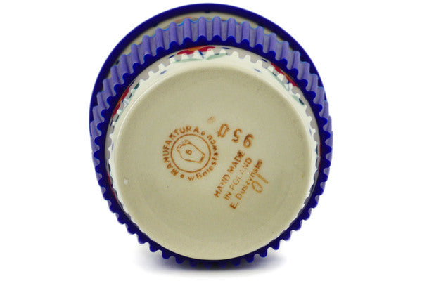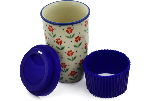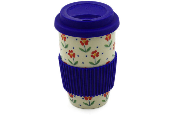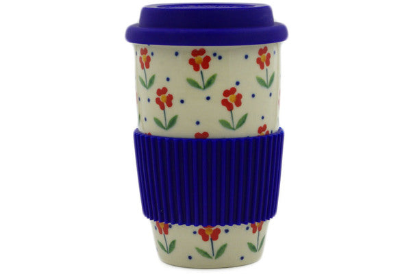 This Polish Pottery Travel Mug is handmade and handpainted by the Manufaktura factory in Boleslawiec, Poland. Manufacturer item number H9471J. It is 5¾" high and measures 3¾" by 3¾". The capacity of this Travel Mug is 14.54 oz (brimful) and it weighs 0.9 lbs. It is part of the Red Primrose Collection.