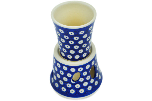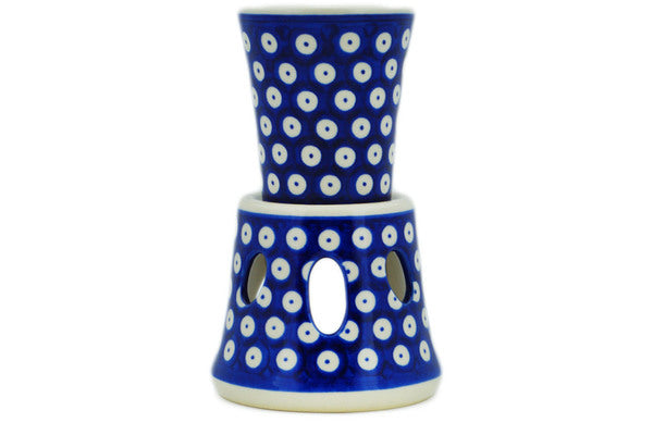 This Polish Pottery Tumbler with Heater is handmade and handpainted by the Vena factory in Boleslawiec, Poland. Manufacturer item number H8098N. It is 3" high and measures 3½" by 3½". The capacity of this Tumbler with Heater is 4.23 oz (brimful) and it weighs 0.8 lbs. It is part of the Blue Eyes Collection.
