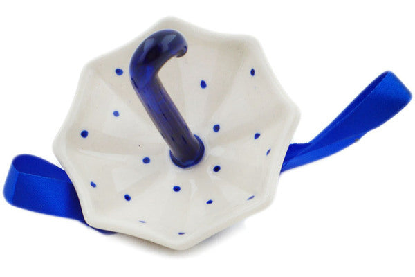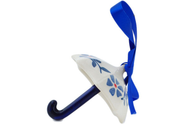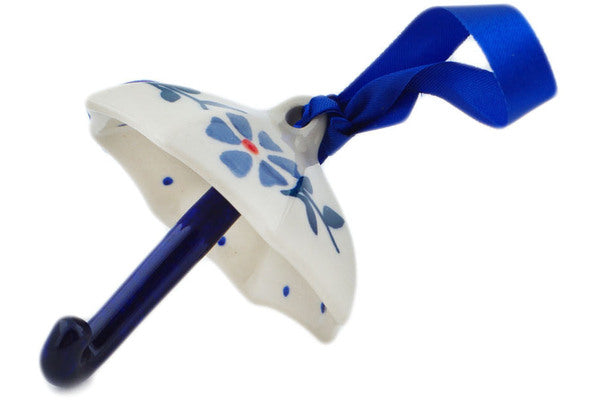 This Polish Pottery Umbrella Ornament is handmade and handpainted by the Manufaktura factory in Boleslawiec, Poland. Manufacturer item number H7045O. It is 3" high and measures 3" by 2½". The weight of this Umbrella Ornament is 0.1 lbs. It is part of the Peacock Forget-Me-Not Collection.